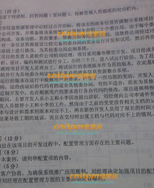 案例分析,第一题得第二问太有趣了,没考虑13,14周资源已用完,处于停工状态,至少扣10分;而第三题的话配置项的主要内容,真的很有歧义(就像有人问你今天考试的主要内容是什么,有人回答:综合知识,案例分析,论文,而我们回答了一些小项,比如质量管理、网络知识、软件工程知识,这有错吗?),导致我写了那些配置项标识,又要扣10分左右。