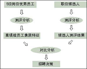 先采用成熟的人才测评量表对员工进行测评,并取得员工的绩效数据,采用统计的方法找到和绩效有关的员工特征,从而建立基于测评工具的高绩效员工特征模型。由于这种方法结合了测评工具,具有实施便捷、风险小、企业操作性强,尽可能地避免了一些传统分析方法的主观性和实施风险性。对于该岗位应聘者的测评的结果,可以和高绩效员工特征模型进行匹配,形成一个匹配系数,从而可以对应聘者进行排序比较,做出招聘决策。(见图二)