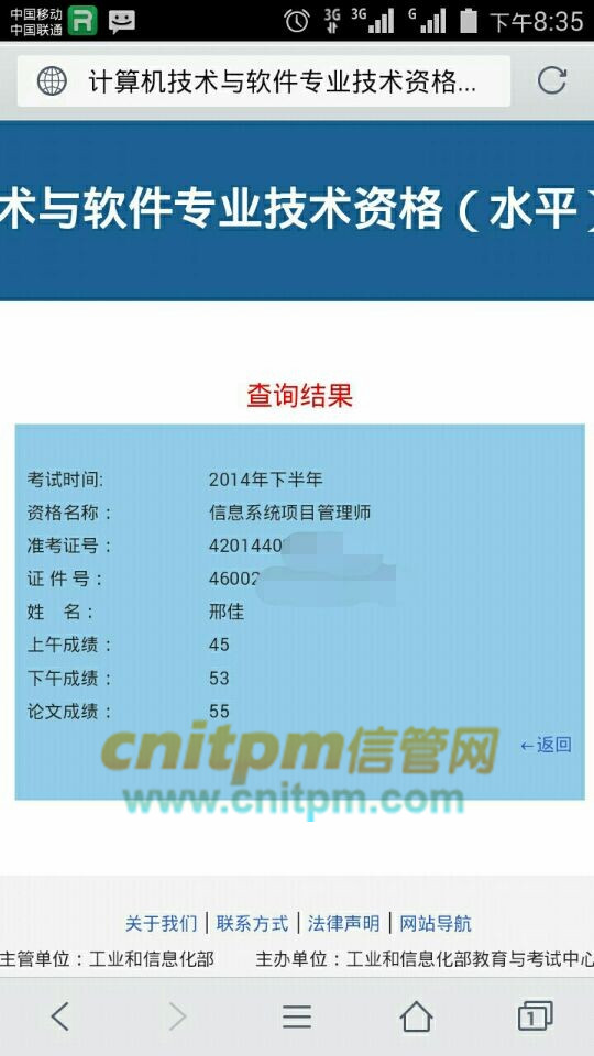 当时我真的没辙了有点想放弃了,还是很感谢网上的培训老师的鼓励,于是我总结认为是我字写得太差了,然后从7月份开始练字,天天坚持练,在11月份考试出来时,感觉很不好,对于我写的论文很不满意,当时心情落到谷底了,同时对上午题的时候有不同的答案,有46分有44分的,基于当时真的是不看好这次考试了。但是我坚信只要我不断努力,这个过程我成长了,我有收获了,通过也是迟早的事情,于是当下成绩出来的那一块45、53、55,我几乎激动得想哭,论文没有让我失望,上午考试给我了运气,项目管理师的通过给我的人生路增加的筹码,感恩,感谢,总共考了4次,一次次的心痛一次次的自我激励,感谢我老婆的谅解,感谢身边朋友的支持,感谢pmp的学习。2014完美收官,这种感觉太棒了,yes!
