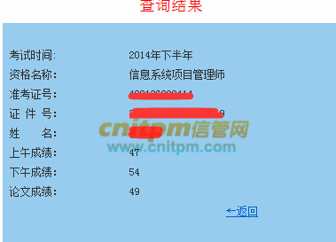 中级一次性通过,信心大增,于是就报考了高级,高级是9月份开始看书的,由于高级和中级的内容相差不大,9月份我主要是看了一遍中级的课本。10月,我出差回来,开始看高级的网上视频。10.1七天假期过去后,我开始做真题,准备论文,这个论文通过了也是运气,由于出差回来比较累,状态还没有回来,根本没发静心看书,特别是对于论文,我看了一些模板,其他我是很讨厌写作的一个人,记忆力也较差,但是论文框架是一定要记住的,龙头,凤尾,猪肚!记住了论文框架,背写下基本框架,然后用项目管理过程去套。高级考出来我最担心的是论文,因为语言组织能力是我得短板。在查成绩的时候我很紧张,点击查询后看到:47,54,49我很是激动,论文通过了,再也不用考软考了,看到我旁边的人考了中级3次没过,于是直接考高级算了,可是考了2次高级也没过。14年我一次性通过中高项,我很是激动。
