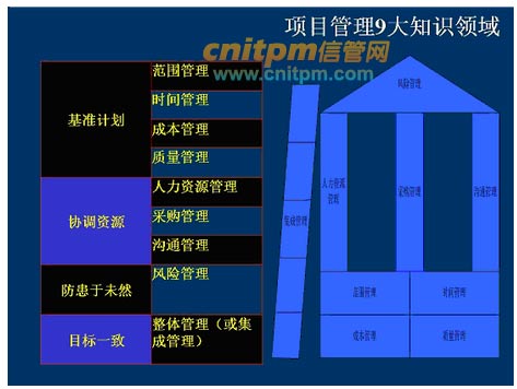 项目人力资源管理、项目沟通管理、项目采购管理这三个知识领域是为了协调资源,相当于我们项目的柱子,是支撑。项目风险管理是为了防患于未然,相当于我们项目的房顶。