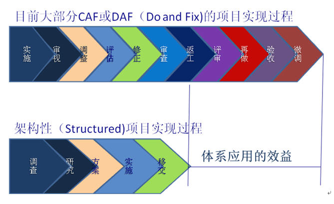 不管是DAF的技术实施过程,还是CAF的系统开发过程,他们的共同点便是没有一个固定的、架构性的开发模式,缺乏一个技术实施的规范和工作上的逻辑,使负责管理的领导只知道最终希望会有什么结果,但不知道下一步会产生什么成果,需要哪些资源,多少时间,多少投资,问题发生的时候该如何处理,或如何预防。这是我国企业领导的悲哀,也是为什么他们对“项目管理”寄存这么厚的希望和期待的主要原因。
