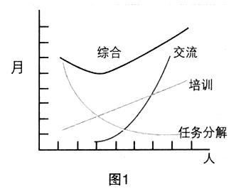 关于培训,每个成员新进入到一个IT项目团队时都需要对该项目的主旨、技术、目标和团队内部的工作条例等进行领会和掌握。这种培训不能分解,而且需要至少一名老员工对他们进行业务指导和培训。因此,这部分增加的工作量随人员的数量呈线性变化。