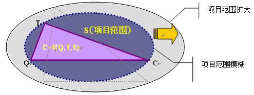 如果项目范围即既定的面积S不变,成本C、质量Q、时间T就可以在一个固定的S的边界限制下给出一个约束的关系模型Cost=f(Quality,Time,Scope)。但是,如果S的值并不固定,就如图1所示出现边界模糊或者向外扩展时, C、Q、T就失去可依赖的边界限制,其之间的约束关系就会变得复杂。因此,我们在对项目范围进行控制时,一是要保证项目初期的S是准确可靠的,尽量减少边界的模糊性;二是要保证项目实施过程中S的稳定,尽量避免扩大化,或是说让扩大化受到合理的控制。