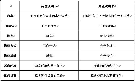 基于上述原因,西方的人力资源工作者提出,应当以角色(作用)分析来代替传统的针对岗位的工作分析,提倡抛弃传统的职位说明书,代之以角色说明书,提倡在进行工作分析和编写说明书的时候,将重点放在角色(作用)上,更加强调结果而非过程。这种从关注“岗位”转变到关注“工作作用”的趋势更加适合研发团队、高层管理团队、销售团队、咨询团队等这种对以团队工作模式而非以个人为基础开展工作的组织。角色说明书与传统的岗位说明书的区别如下。