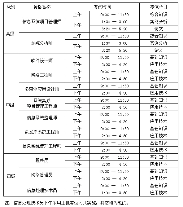 考试级别分5个专业:计算机软件、计算机网络、计算机应用技术、信息系统、信息服务。每个专业又分三个层次:高级资格(高级工程师)、中级资格(工程师)、初级资格(助理工程师、技术员)。对每个专业、每个层次,还设置了若干个级别。考生可根据自己的水平以及熟悉的专业情况选择适当的级别报考。