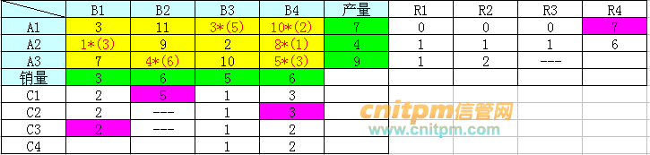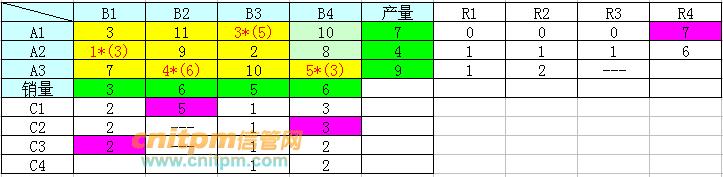 第四步:按照以上方法,找出R4和C4中的最大值(7),取B3和B4中最小的元素A1B3=3,把B3的销量5全部分配给A1B3=(3*5),把B3列划去。如下图3-13