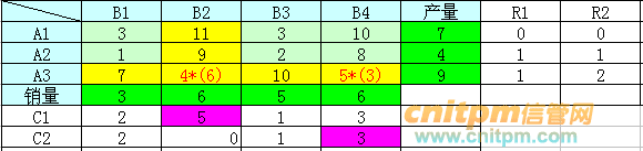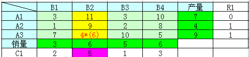 第一步:在表3-3中分别计算出各行和各列的最小运费和次最小运费的差额, 并填入该表的最右列(R1)和最下行(C1),见表3-10。从行(C1)或列(R1)差额中选出最大者(5), 选择它所在列(B2)中的最小元素(4)。可确定A3 的产品先供应B2 的需要,即把B2的销量6全分配给A3B2=(4*6)。同时将运价表中的B2 列数字划去(黄色表示已经分配)。