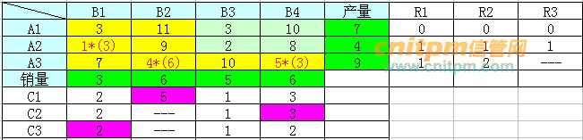 第三步:按照以上方法,找出R3和C3中的最大值(2),可知C3的B1和B4都等于2,取B1和B4中最小的元素A2B1=1,把B1的销量3全部分配给A2B1=(1*3),把A3列划去。如下图3-12