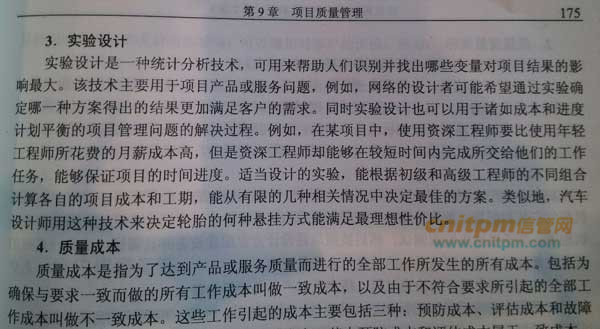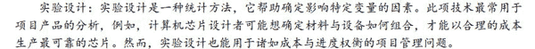 我给大家解释:B主要针对投入产出比,和题意不符;D质量成本分析重在衡量因质量所产生的成本;C实验设计是一种统计分析技术,可用来帮助人们识别并找出哪些变量对项目结果的影