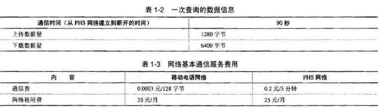 某公司销售人员在办公室时通过PC来访问应用服务器,若在公司以外,则通过具有数据显示功能的移动电话或PDA (Personal Digital Assistant)访问公司网络。进行一次查询的数据信息如表1-2所示,网络的基本通信服务费用如表1-3所示,总费用=网络租用费+通信费。