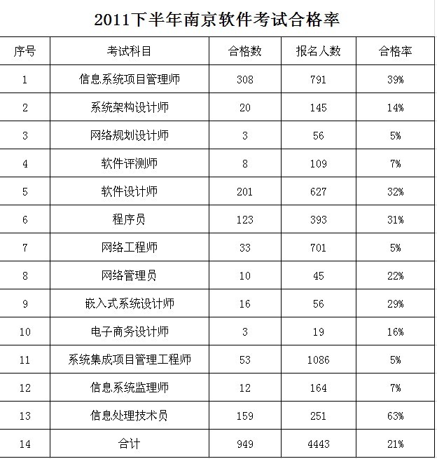 2011下半年南京参加系统集成项目管理工程师考试的人数是1086人,通过了53人,合格率为5%