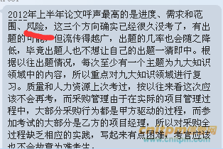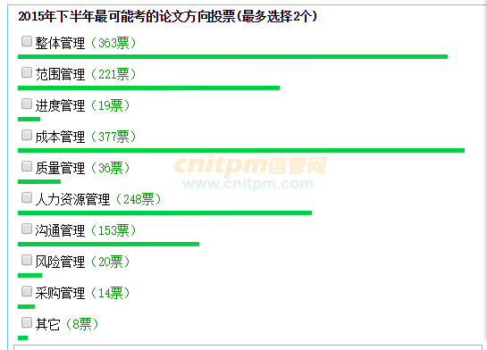 2012年上半年论文呼声最高的是进度、需求和范围、风险,这三个方向确实已经很久没考了,有出题的可能,但流传得越广,出题的几率也会随之降低,毕竟出题人也不想让自己的出题一猜即中。根据以往出题情况,每次至少有一个主题为九大知识领域中的内容,所以重点对九大知识领域进行复习。质量和人力资源上次考过,按以往来看这次应该不会再考,而采购管理由于在实际的项目管理过程中,大部分采购行为都是甲方驱动的过程,而参加考试的大部分是乙方的项目经理,所以对采购全过程缺乏相应的实践,写起来有点困难,考官应该也不会故意为难考生。