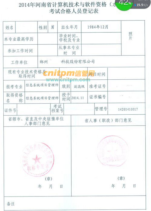 河南省软考高级信息系统项目管理师考试合格人员登记表(级别为副高级)