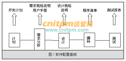 基线(baseline)是软件生命期各个开发阶段末尾的特定点,也叫做里程碑(milestone)。连续的开发工作在这些点上被分割开来进行成果检验,必要时可以进行变更控制。有了基线,就可以防止开发中的错误跨越阶段向后扩散,也可以防止跨越里程碑去修改另一开发阶段的工作成果。软件配置基线如下图所示。