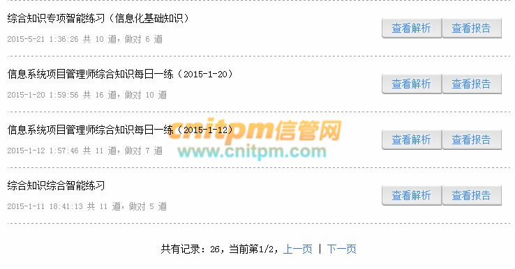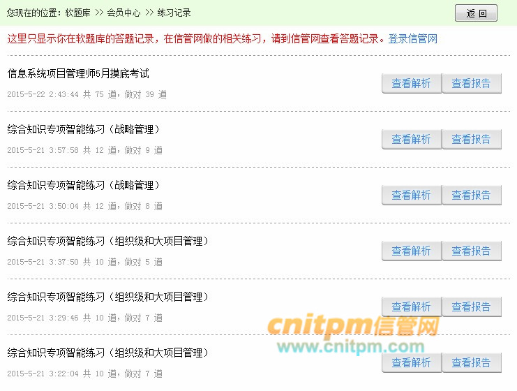 第二次考试:这次与第一次相比,我注重了计算题的复习,如挣值计算、进度图、运筹学题等,我都学了一遍。由于第一次的结果其实只是案例题失手,我着重看了一下案例题,找了一些真题来看,但只是看而已,没动手写。对于上午题,我基本没准备,只是复习了一下项目管理的九大领域。这次考后我感觉还可以,案例题都顺利做完了,觉得挺容易,有的题目简直是送分题,有很大的通过把握。正是这次考后,我通过网上搜索信管考试答案想估分,才知道了JRS直播这个网站,并看了几篇成功人士的经验介绍。查分时,我是满怀着信心和希望呀,结果却让我凉了半截:又是卡在案例上,差了那么几分。这次又是失败!