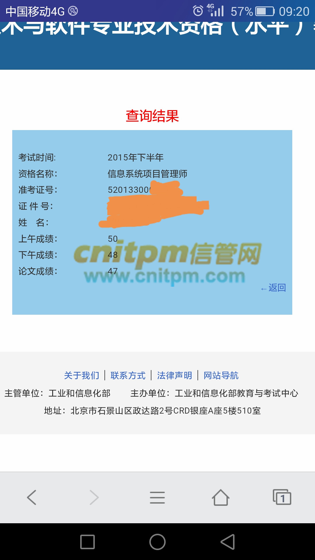 今年突然想没事考个试,因为一直是做系统集成这一块,现在主要做信息化项目的售前兼项目经理,今年上半年考的系统集成项目管理工程师,9月份考的pmp,然后想着趁有基础在,就一鼓作气,也报了11月份的信息系统项目管理师,有不少的项目管理内容和pmp类似,相对也简单一点,自己原来也是做网络集成的,一些基础的知识还算行,一直等着考试成绩,天天在看,昨天晚上看到可查,一看竟然过了,非常开心!