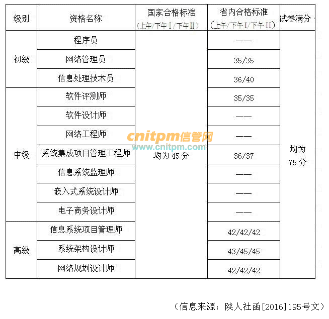 JRS直播讯:根据陕人社函[2016]195号文,2015年下半年陕西省计算机技术与软件考试高级信息系统项目管理师各科目省内合格标准如下: