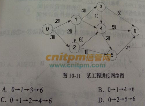 在工程进度网络图10-11中,若节点0和6分别表示起点和终点,则关键路径为