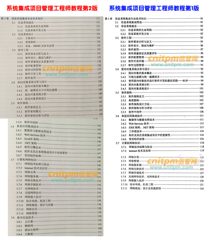 系统集成项目管理工程师第2版第3章与老版教材对比,修改内容较多,由原先7个章节增加为8个章节,但是实际增加了“信息系统设计”和“新兴信息技术”2个知识点,而去掉了“信息系统集成简述”这个知识.