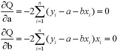 求极值可以使用微积分中的求极值方法,首先令Q(a,b)对a和b分别求偏导,并令偏导为零,得如下方程组: