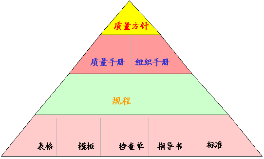 表格、模板、检查单、指导书、标准:每个规程都有对应的一系列此类文档,是对规程的补充。比如说有项目管理规程,对应就有项目计划的模板、项目管理的指导书等一系列文档。