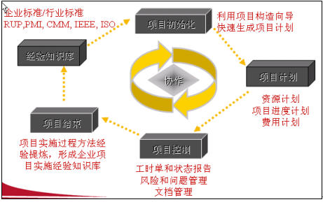 2)项目管理流程:项目经理和项目团队成员在执行项目时可以遵从的一种作业流程,其中定义了在项目实施过程中各个阶段的主要项目管理活动,同时还会提供一些可以参考和选择的工具及模板。比如我们的变更管理程序、版本发布制度、实施服务指南等等。