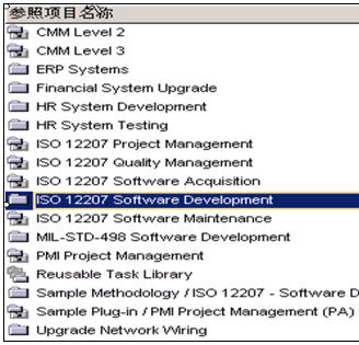 Methodology Manager-方法论管理器:完备的项目实现过程/方法管理套件,可以创建和再利用企业项目管理经验/知识库,共享项目成功经验。在MM中,软件提供如下现成的IT项目管理模板:ISO12207、CMM3、CMM3、MSF、RUP等。如下图: