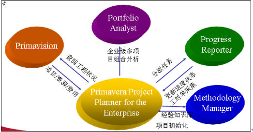 P3E是美国Primavera公司推出的企业级的项目管理工具,已被NOKIA ,Motorola,波音公司等大型企业普遍采用。软件由5个部分组成,如下图所示: