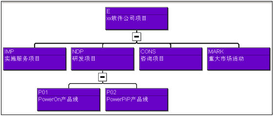 所以实现企业级的多项目统一管理,建立企业项目分解结构(EPS)是首要任务。IT公司存在的项目一般包括新产品研发项目、实施服务项目、重大市场活动、咨询项目等等。下图是一个典型的IT公司项目分解结构: