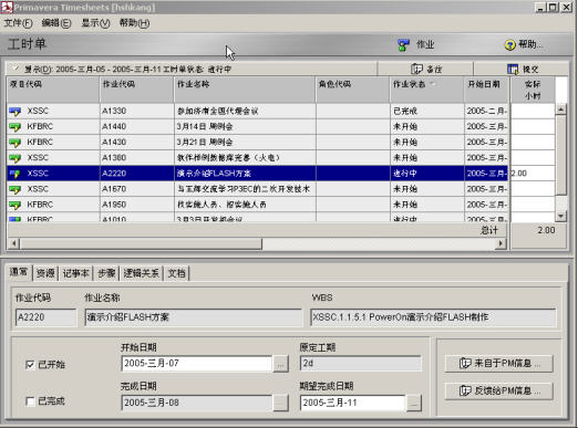 在P3E的工时单反馈界面,软件自动列出本期需要用户参与的任务。用户可以1)记录任务的实际开完工时间;2)可以获取来自项目经理的信息,也可以就当前任务向项目经理反馈意见;3)使用记事本记录完成该任务的工作日志;4)挂接与该任务相关的文档;5)反馈作业步骤完成情况;6)填写针对单个任务,每天或者每星期实际工作小时数。填写完毕,选择提交,该表单即不可编辑,等候工时单批准人审批。