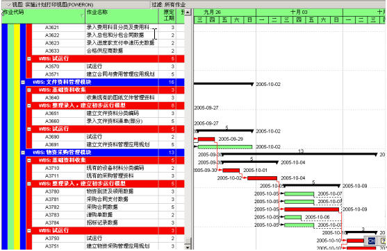 下图是某个实施服务项目的进度计划(局部)。从图中可以看出,物资采购模块的实施从9月30日开始,10月12日结束(采用7天工作制)。需要13天时间。其中调研、基础资料收集5天,数据输入、建立初步运行模型5天,评审试运行3天。