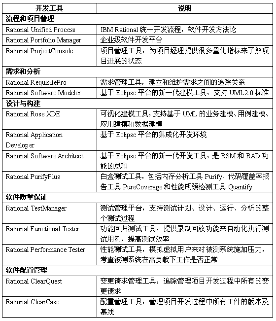 好的方法也需要优秀的开发工具的支持,IBM 软件开发平台也为项目团队中的不同角色准备相应的开发工具,这些开发工具可以满足软件开发的整个生命周期的需要,主要包括以下产品: