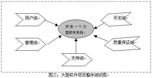 在大型应用软件开发项目组织设计中,我们首先要从整体考虑项目组织的组成,然后再重点考虑项目内部组织的结构。从整体上考虑,可分分为若干个按项目小组,如:用户代表组,管理组、开发组、质量保证组、支持组等。如下图所示: