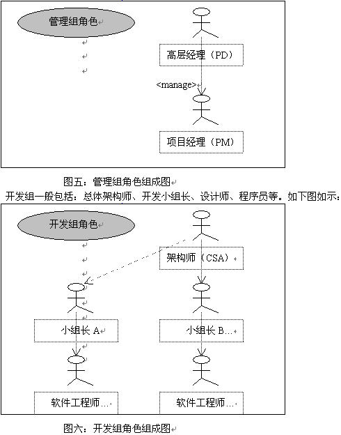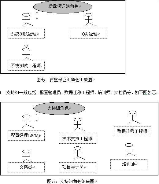 注:在中型、小型的软件项目组织中,部分角色可以兼任,但是SQA和系统测试小组应保持其独立运行。SQA组(质量小组)可越过项目经理向高层经理直接进行报告;测试小组也可不依赖软件开发人员,来计划和准备系统验收测试用例以及测试规程。另外,角色种类还要依据具体项目而定,例如在有的软件开发项目中,还有设置有产品经理角色。