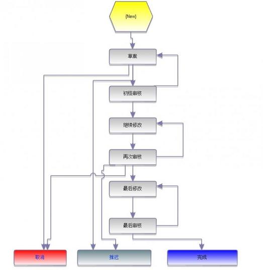 下面两个图是一个典型的文档的流程的,第一个图是在系统中自定义设置一个流程,第二个图是系统客户端的实际使用情况,可以看到,一个文档从新建到最终成型在正常情况必须通过每个状态的负责人的处理后,走完这个流程,这样子基本上能够保证一个文档的质量。在系统中,每个能进入的系统的人,只要一进系统就可以看到自己需要处理的不同状态的文档任务,包括写文档、修改文档和审核文档。