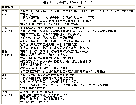 工作行为是指项目经理在履行岗位职责时所表现出来的行为和工作态度。本文在对软件企业进行大量访谈的基础上,结合前面所述的软件经理应该具备的基本能力,分析出了项目经理为了有效发挥自身能力必须开展的几项关键工作行为,见表1。