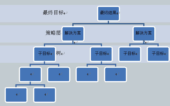 在这样一个分析结构当中,经过实践发现,第一步应该增加一个层次,提供不同策略的选择分支,然后才是不同策略下所需要的充分条件。这种方式的好处在于,当存在不同的可选解决方案时,这种分析方法对于决策能提供很好的支持。同时,在以后项目实施过程中如果条件发生了变化,还可能利用当时已有的条件,通过另外分支中的解决方案来实现目标。