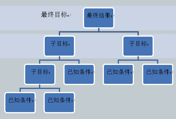 其实这种倒推的方法大家并不陌生,项目管理本身就是从目标出发的,这一点从“项目”的定义就可以看出,“为了实现特定的目标而采取的一系列行动”,所有的行动都是目标导向的。例如在进行范围分析、编写WBS的过程中,就是采用的自顶向下的分解、倒推的方法。同样,在倒推寻找充分条件的过程中,我们也可以采用类似的方式,从目标出发,逐步分析、分解充分条件: