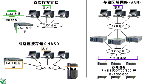 我们对SAN和NAS进行比较后不难发现,这两种相互竞争的技术实际上是互补的。SAN和NAS是在不同用户需求驱动下的独立事件,SAN是以数据为中心的,而NAS是以网络为中心的。概括来说,SAN具有高带宽块状数据传输的优势,而NAS则更加适合文件系统级别上的数据访问。