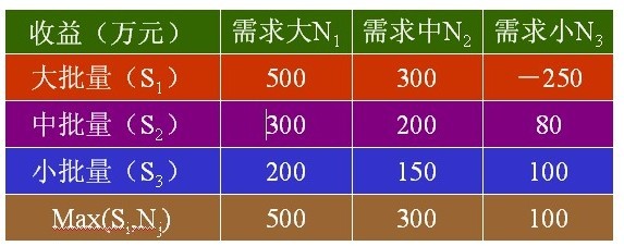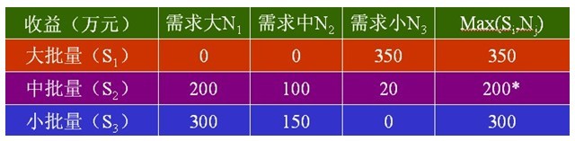 后悔值决策法的特点是,当某一种自然状态出现时,决策者选择的准则很明显,应选择收益值最大的方案为最优方案。如果决策人当初并没采取这一方案,而是采取其它方案,这时就会感到“后悔”,遗憾当初未选择最大值的方案。为了避免将来遗憾,因此采用大中小的方法。