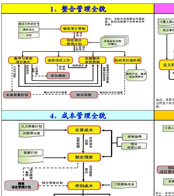 项目管理九大知识领域各过程逻辑关系图,包含了9大管理领域的整体管理、范围管理、时间管理、成本管理、质量管理、人力资源管理、沟通管理、风险管理、采购管理的过程以及关系。