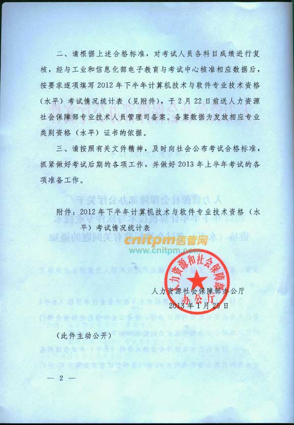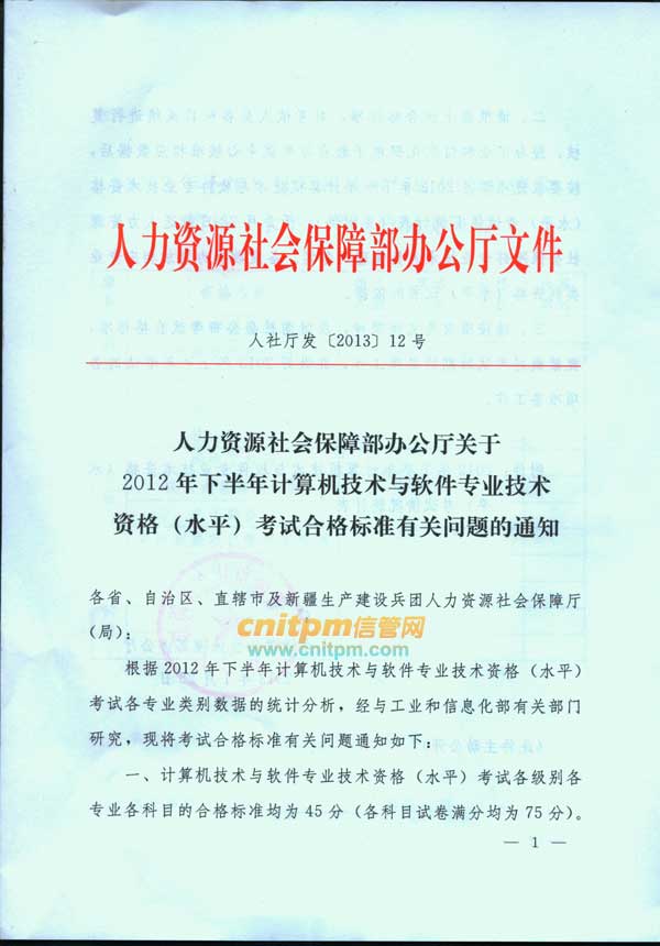 JRS直播第一时间获取了人力资源和社会保障部发布的《关于2012年下半年计算机技术与软件专业技术资格(水平)考试合格标准有关问题的通知》文件,合格标准仍然是45分,以下为合格标准通知扫描件
