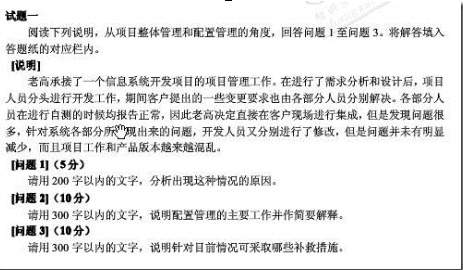 那个时候的题目比现在的简单,因为在题目的标题处就已经告诉你他这个题目考的是啥了(……,从项目整体管理和配置管理的角度,……),而现在就没这么容易了,你需要去自己判断某个题目它涉及到哪些知识点,如2009年的一个试题: