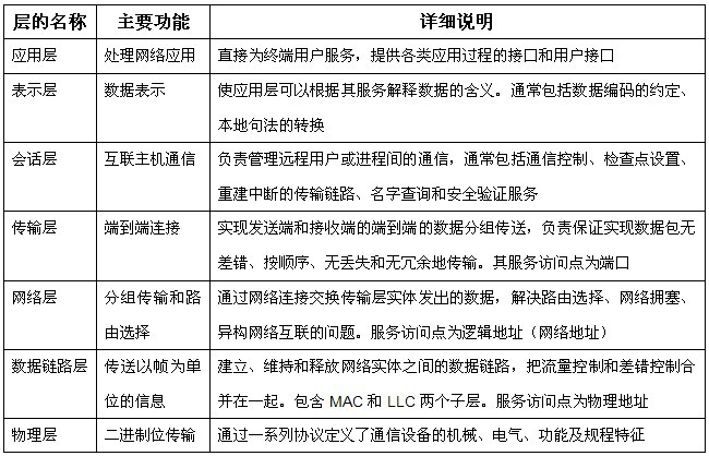 开放系统互连参考模型(Open System Interconnection/Reference Model,OSI/RM),从下往上分别是物理层、数据链路层、网络层、传输层、会话层、表示层、应用层7层结构。