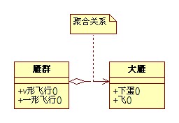 聚合:空心四边形+实线+箭头(雁群和大雁的关系);