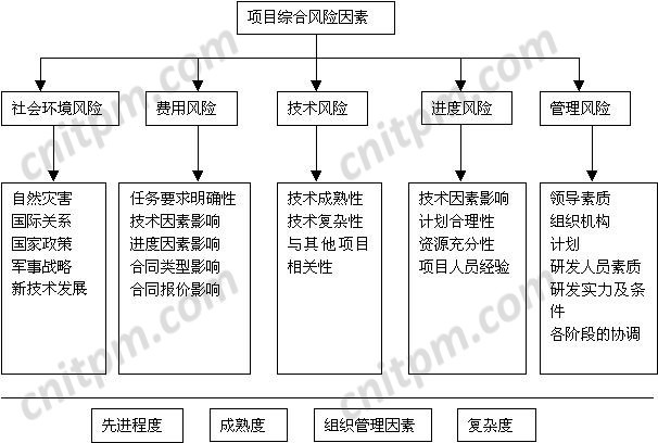下面,结合大多数项目管理的实际情况,我们给出一个风险因素指标体系图。在项目决策时,我们可以从下面几方面对项目风险进行分析,其风险因素指标体系图示如下: