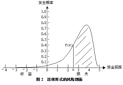 在某些情况下,后果可以连续地描述,它的点多得可以连续而不离散。此时,风险剖面就形成了一条曲线。例如,考虑一个投资问题,其中的后果是资金回报(收益或损失)。每一种可能性是实际经历的某一个回报的密度函数。后果与可能性形成了一连续的剖面(曲线)。图2是一密度剖面f(x),其中正和负资金数分别表示收益和损失。