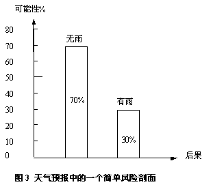 “可能性-后果”这对元素分布的模式称为风险剖面(或风险曲线)。可能性与后果可以分别沿着垂直坐标轴和水平坐标轴表示。图3给出了上述天气预报的风险剖面,两个离散的后果:“有雨”与“无雨”,它们的可能性分别是30%和70%。