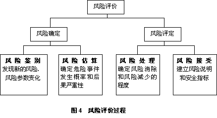 风险评价的过程包括风险确定和风险评定两大部分,又可细分为风险鉴别、风险估算、风险处理、风险接受等4个方面。详见图4所示。风险鉴别是风险估算的前提,风险估算完成后还要对风险进行处理,在费用、进度、产品性能等约束条件下采取措施来控制或消除风险,最后根据残余的风险值和风险接受的标准来决定风险是否能够被接受。